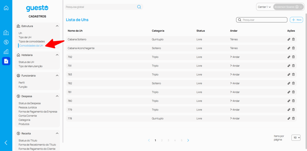2 – Clique em “Comodidades da UH” no submenu de Estrutura.