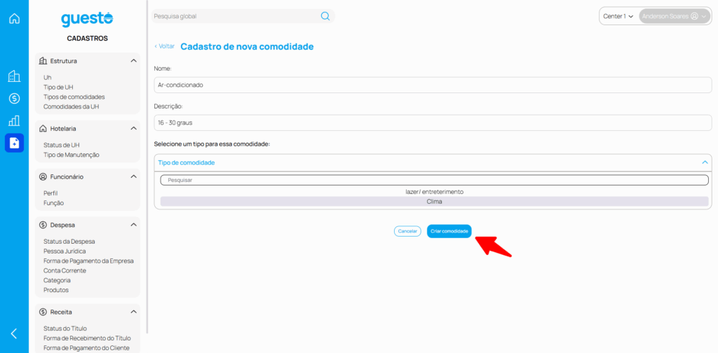 4 – Preencha com as informações pertinentes da comodidade e clique em “Criar Comodidade”.