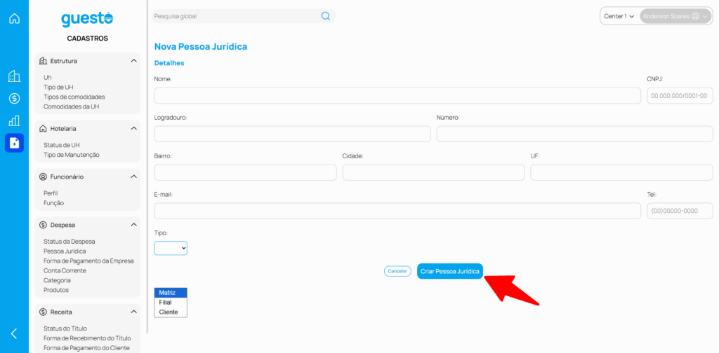 4 – Preencha com as informações pertinentes ao cadastro e clique em “Criar Pessoa Jurídica”.